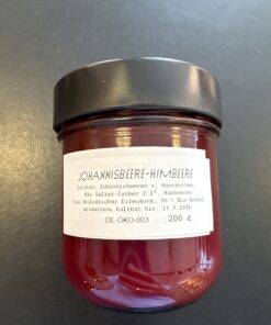 Zutaten: Johannisbeeren vom Hausgarten, Bio Gelierzucker 2:1, Himbeeren aus ökologischer Erzeugung, 70% Bio Anteil